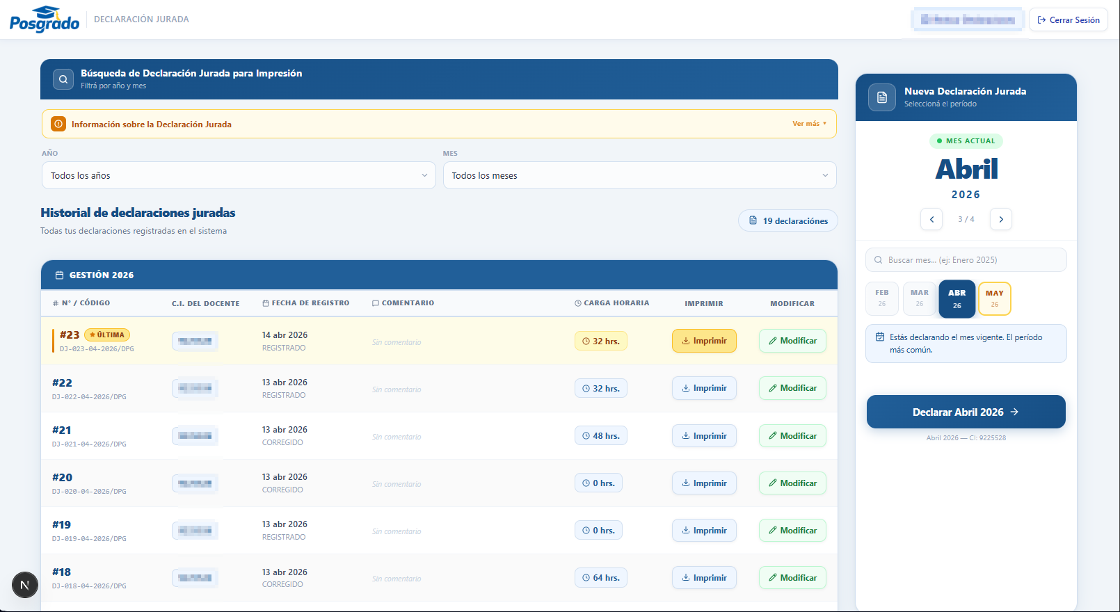 Si después de enviar su declaración se produce algún cambio en su remuneración u horarios, el usuario podrá actualizar la información únicamente mientras la declaración se encuentre en estado de Observación. En caso de que la declaración ya haya sido Aprobada, no será posible realizar modificaciones a través del sistema; cualquier corrección deberá gestionarse de manera presencial ante la Dirección de Posgrado.